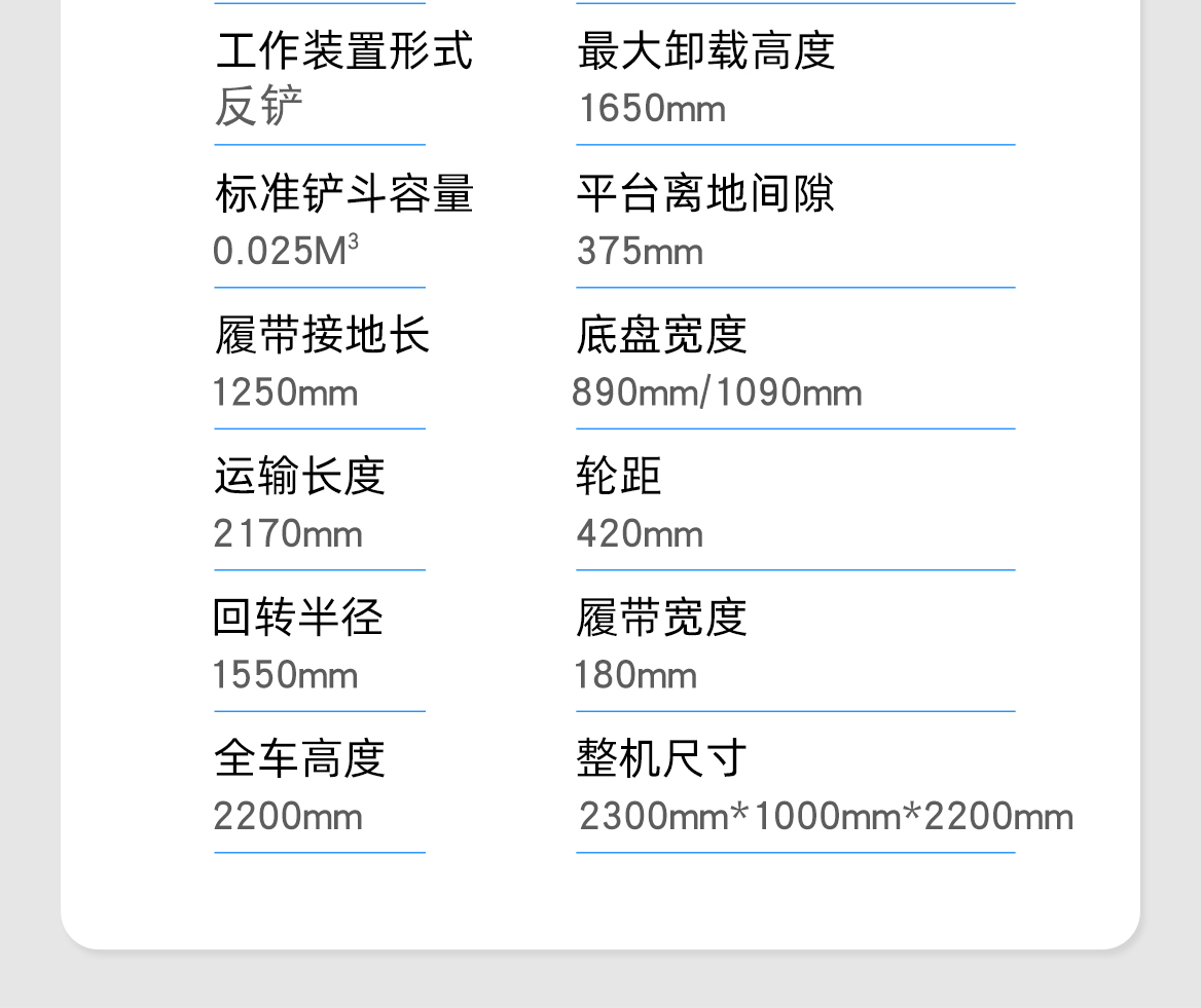 | 工作裝置形式 | 反鏟 | 最小離地間隙 | 385mm |